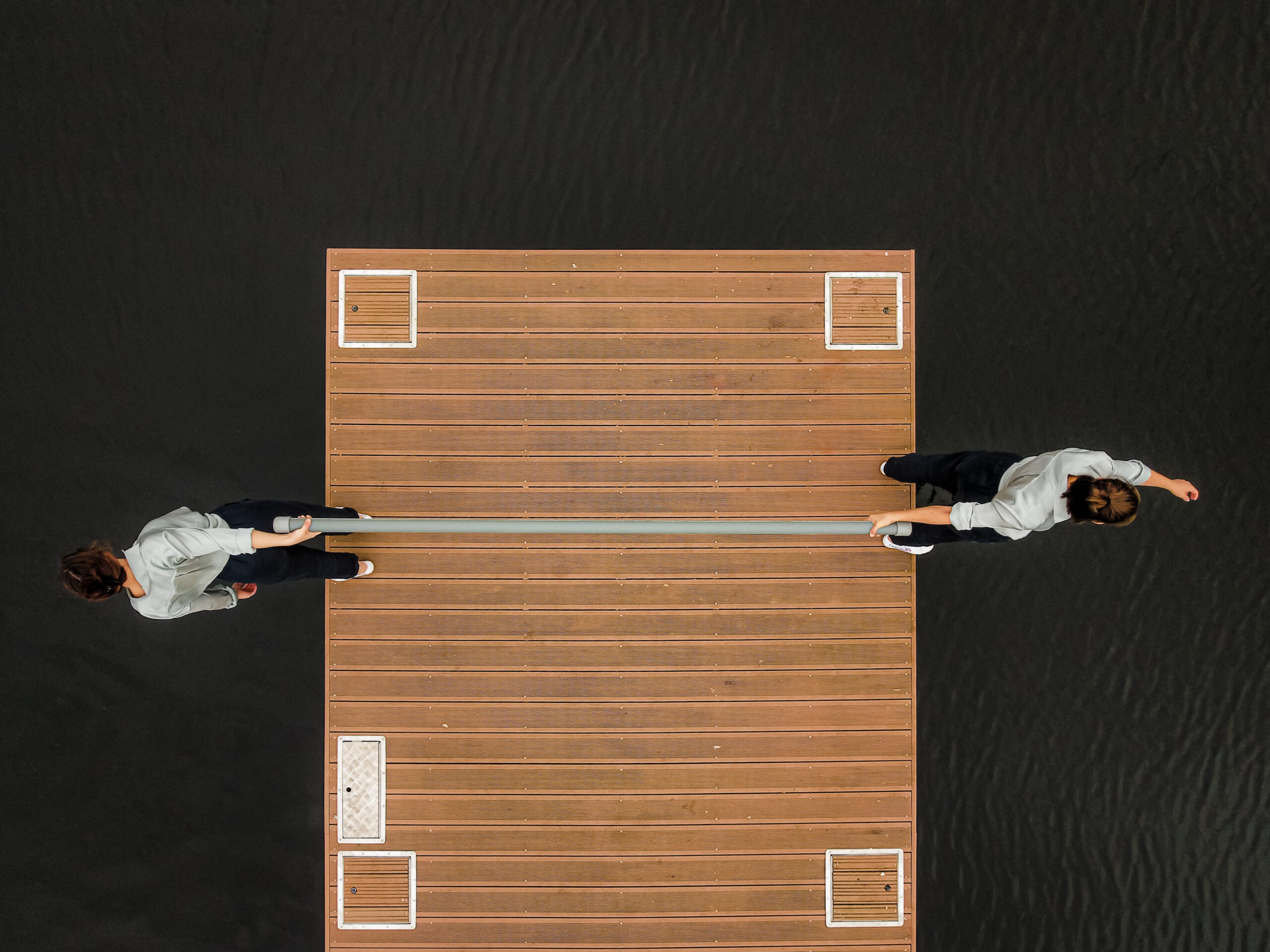 In Leverage, two women defy the balance point of a 2.5 meter long pole. The pole serves as a scale and thus allows the circus performers to defy their physical limits, to define new hierarchies. Climbing, trusting each other and folding under and over each other, the duo is completely absorbed in their relationship. Meanwhile, the pier and abyss below them are surrounded by the ever-looming danger of increasingly wild swirling water.