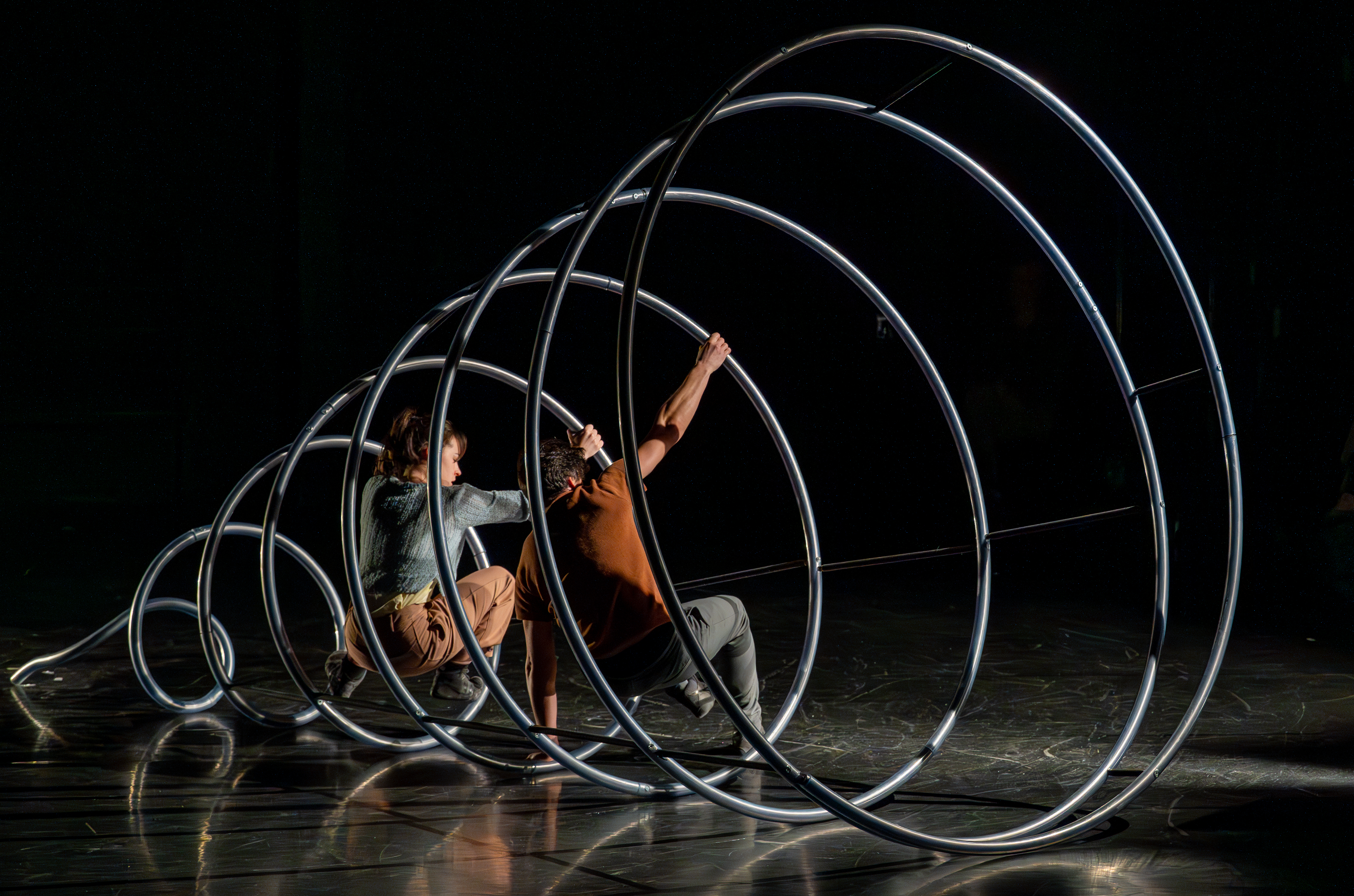 With the help of the spiral, the three performers of TeaTime Company explore themes of balance, influence, power, flow and friction. The spiral allows them to push their limits. Where a jump can suspend time and a fall can last forever. The Ripple effect describes the influence, persistence and consequences of our choices. Just as natural forces cause vibrations and ripples in water, our choices cause ripples in our relationships, thoughts and experiences.As the great spiral rolls across the stage in an endless circle, the performers face constant challenges. They are forced to anticipate and react to the movement of the metal wheel, which at times seems to obey and at other times seems to have a will of its own. At any moment the entire situation can change because of an unexpected move from either spiral and performer.